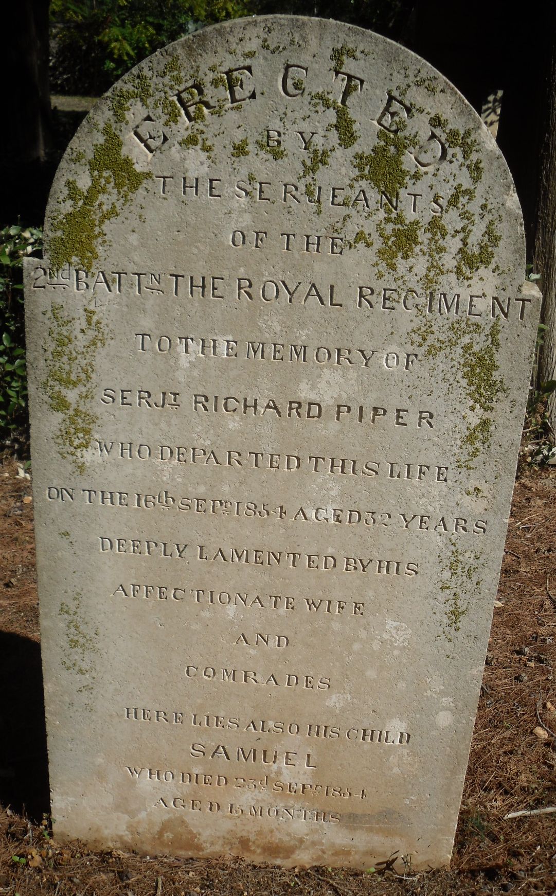 Erected by the Serjeants of the 2nd Battn The Royal Regiment To The Memory of Serjt Richard Piper who departed this life 16th Sepr 1854 aged 32 years. Deeply Lamented by his affectionate Wife and Comrades Here lies also his child Samuel who died 23rd Sepr 1854 aged 15 months